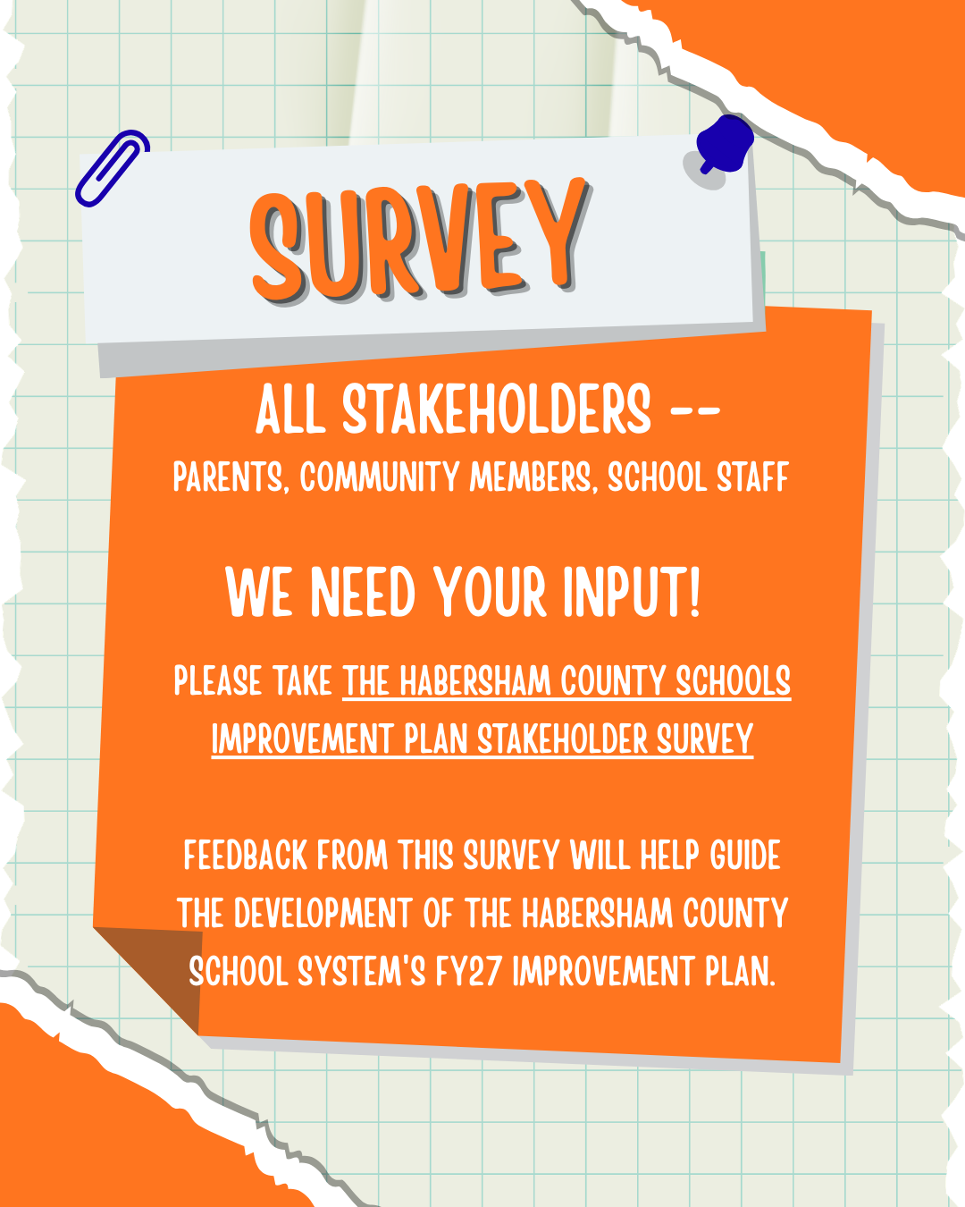 We need your input! This survey may be completed by all stakeholders in our school (parents/guardians, community/business members, and school staff). The survey results will help guide the development of the Habersham County School System's FY27 improvement plan.